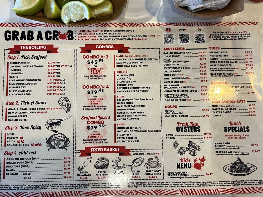 Introducing Grab A Crab, a delightful Cajun/Creole seafood haven located in Hacienda Heights, CA. This trendy eatery is known for its vibrant atmosphere, where guests can indulge in mouthwatering seafood boils, flavorful gumbo, and delectable fried shrimp. The menu features various customizable combos, perfect for sharing with friends and family.